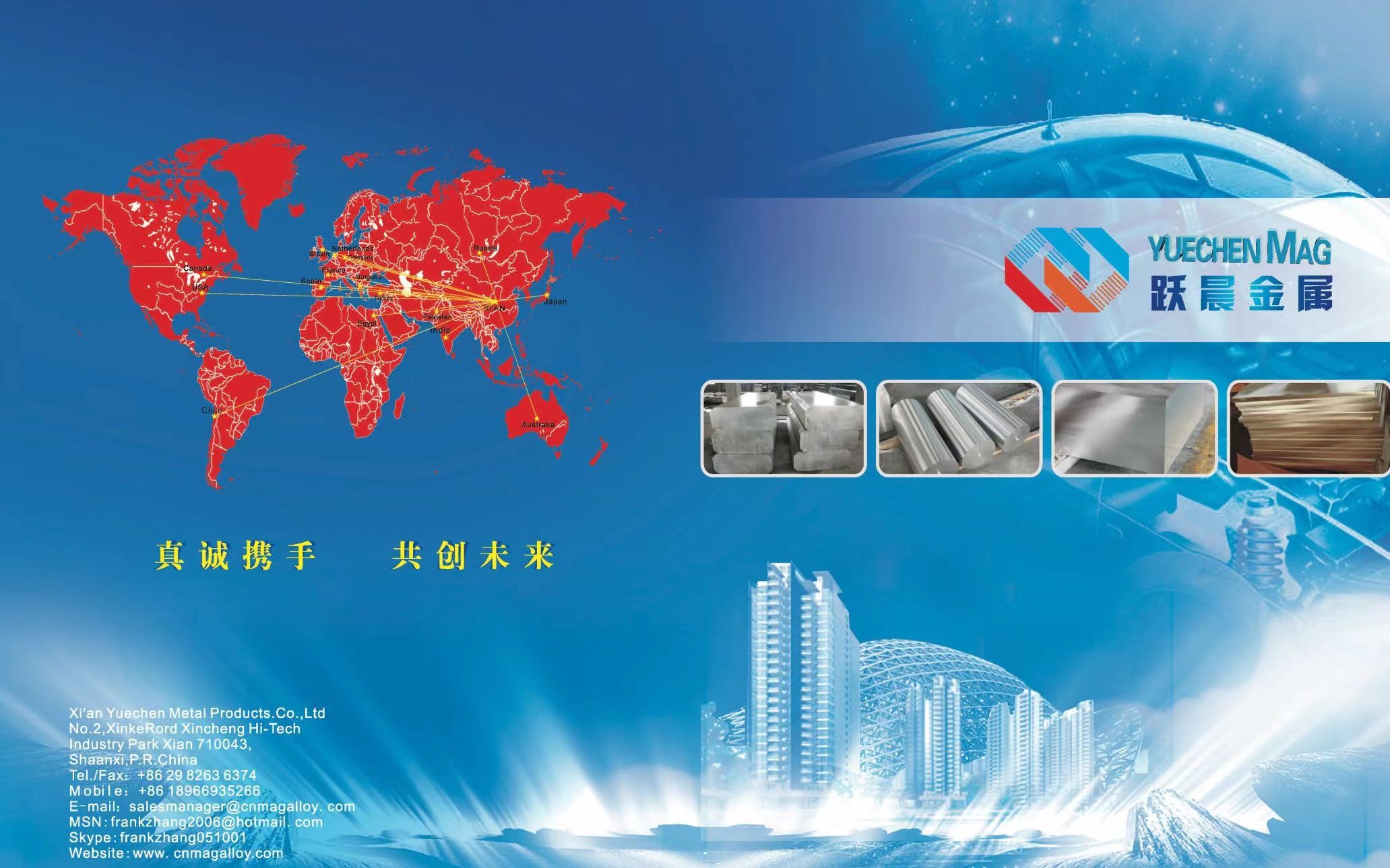 西安躍晨金屬制品有限公司是一家專業(yè)從事鎂合金產(chǎn)品的研發(fā)、生產(chǎn)和銷售為一體的企業(yè),主要產(chǎn)品有鎂合金熱軋薄板,中厚板,鑄板,鑄棒,擠壓管材,擠壓棒材,擠壓型材,鑄件,鍛件以及機(jī)械加工件。